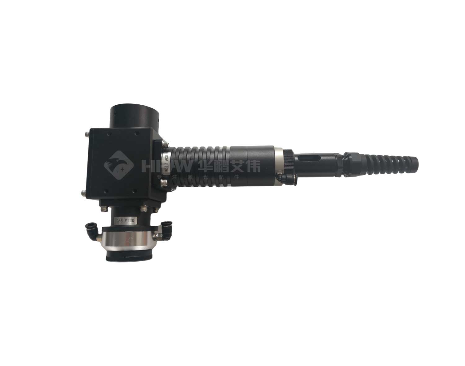 華鵬艾偉提供光纖激光焊接機配件光纖出光頭焊接頭系列,T型光焊接頭規格為:D41.5-F120-150mm,焦距可選。……